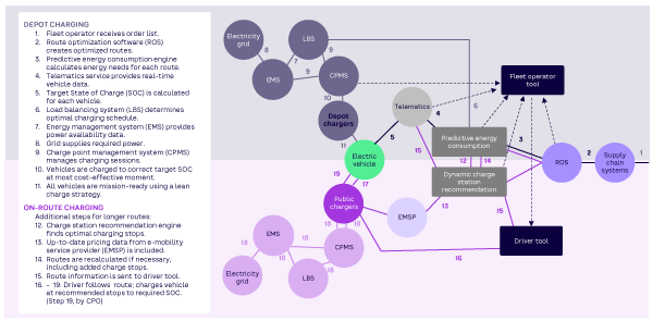 Figure 2 shows the technologies needed for charging and driving commercial vehicles from a depot, on longer routes, and when unexpected situations require dynamic rerouting. It also outlines all the steps and interactions between the various technologies:
